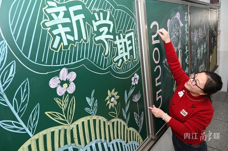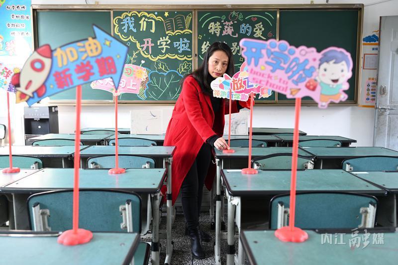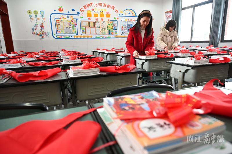 2月10日,内江市第十三小学老师正在精心布置教室,以崭新的面貌迎接新学期学生的到来。