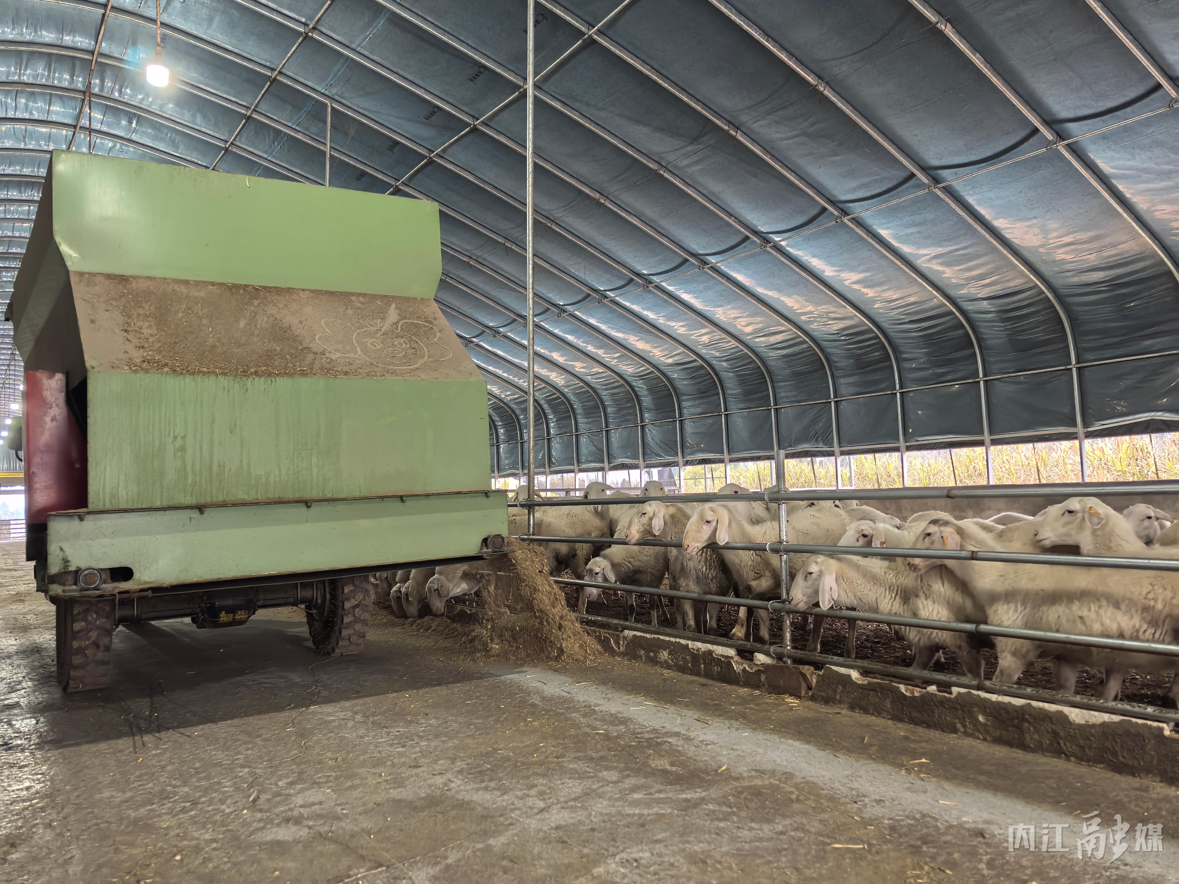不远处,是几个硕大的羊棚,几千只羊儿正翘首以盼美食的到来。很快,搅拌机将饲料制作完成,工人驾驶着撒料车缓缓驶入羊棚,将秸秆饲料均匀铺撒在食槽中。瞬间,羊群蜂拥而上,欢快咀嚼,“咩咩”叫声此起彼伏。内江市东兴区朵二哥养殖有限责任公司的创始人罗炼介绍道:“这些由秸秆加工而成的青贮饲料,不仅营养丰富,还降低了养殖成本,真正实现了变废为宝。”