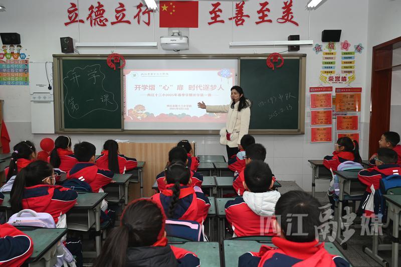 清晨,内江市第十三小学校内洋溢着浓厚的开学氛围。操场上,学生们在老师的带领下快乐地做游戏,欢声笑语在校园上空回荡;教室里,气球、窗花等装饰品将教室装点得焕然一新,黑板上“新起点,新梦想”“好好学习,天天向上”“元气满满”等字样格外醒目,满载着对新学期的美好祝愿。老师们精心准备了春季学期的“开学第一课”,通过一系列富有创意和启发性的教学活动,引导学生们迅速调整心态,投入到接下来的学习生活中。