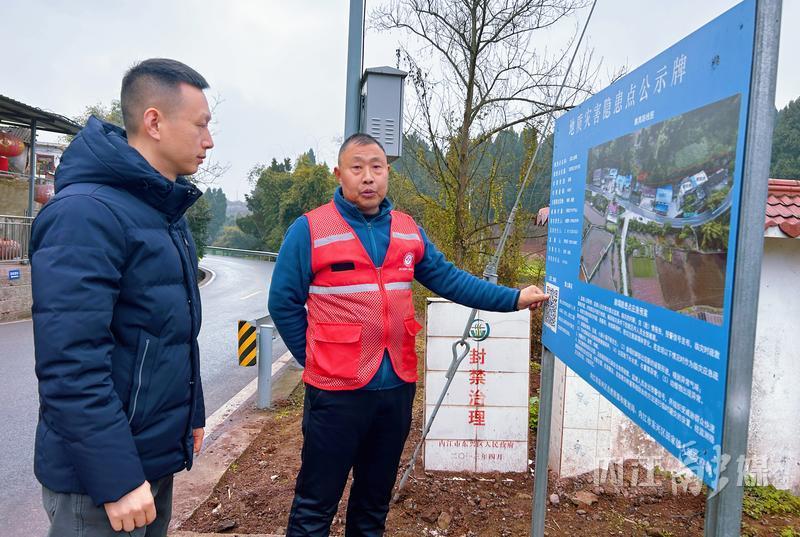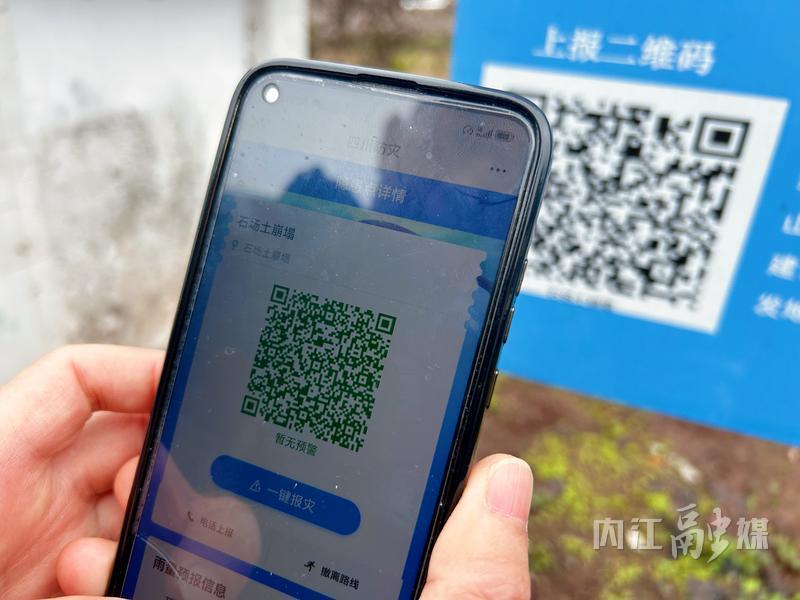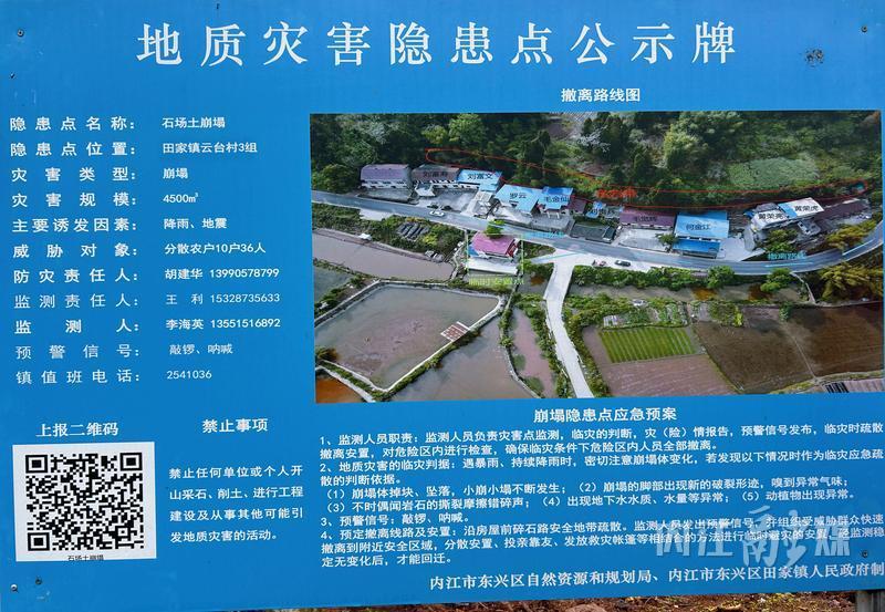 除了“人防”,东兴区还积极引入“技防”手段。在石场土崩塌隐患点,记者看到一块公示牌,左下方有一个“上报二维码”。用手机扫描二维码,便可进入“四川防灾”页面,看到该隐患点的名称、编号、地理位置、规模等级、险情级别、威胁人数等信息。页面还提供了“一键报灾”功能和撤离路线示意图,红、黄、蓝色,分别表示危岩带、危险范围和撤离路线,每一座农房上都标注了业主名字,临时安置点的位置也一目了然。