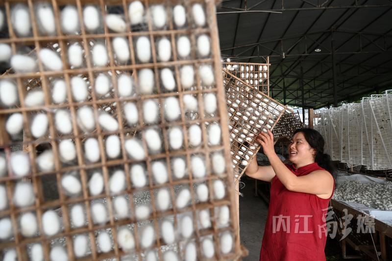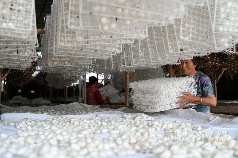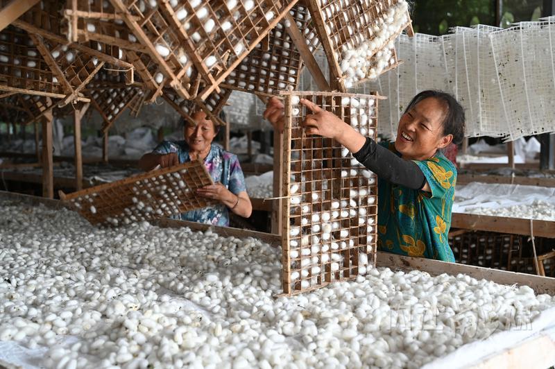 6月14日,在内江市东兴区双桥镇凤龙村,蚕农忙着收获蚕茧。