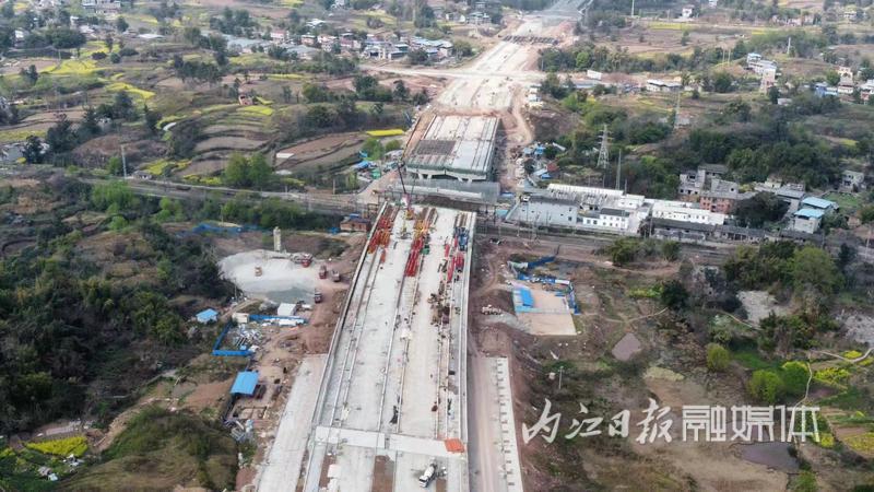据长江重庆航道工程局项目经理张志超介绍,目前,已完成1号桥的第一联至第五联的右幅箱梁施工,第四联箱梁左幅箱梁已完成第一次浇筑,道路工程完成路基及管网施工;涉铁工程完成多处桥墩、预制箱梁钢筋绑扎及接触网基础施工等。“预计4月30日完工通车,届时从主城区到隆昌高铁北站,只需10余分钟。”