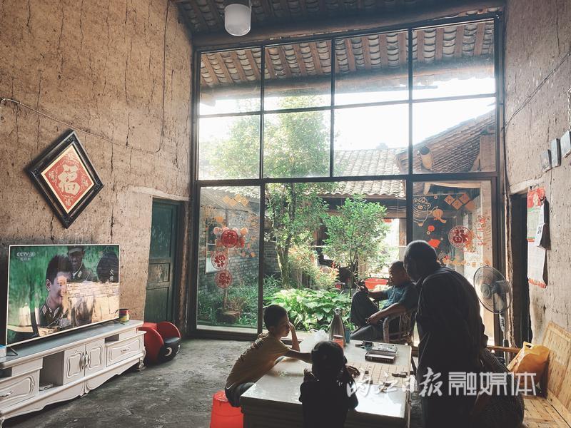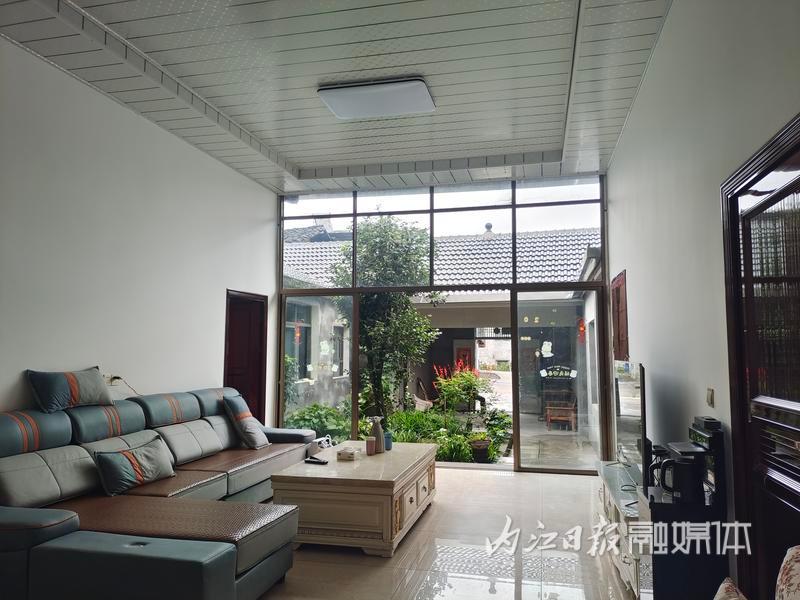 离钟盛英家老房子不远处的一个四合院,门前是宽敞的院坝,院子中央有一个天井,花花草草郁郁葱葱。正厅放置着沙发、电视,格外敞亮舒适。很难想象,这个兼具传统与现代气息的四合院,以前的房屋是土坯房。