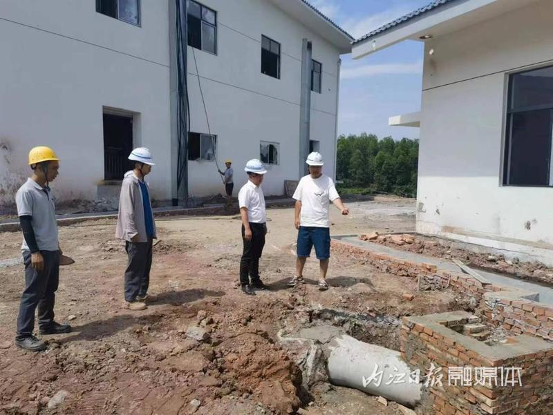 三水厂内,新建送水泵房干净整洁,配水井、絮凝沉淀气浮池、V型滤池、清水池安装建设完毕,供水主管网铺设完成35公里,正进行机电设备调试安装。