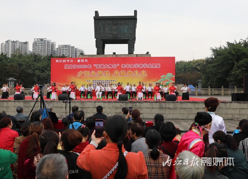 与此同时,隆昌市莲峰公园,一场以老年人为主角的“夕阳共携手 勇毅向未来”教学成果演出正在举行。器乐合奏、书画表演、太极拳、时装秀……丰富多彩的节目将牌坊文化、青石文化等文化元素和孝老爱亲的中华优秀传统美德巧妙融合,充分展现了老年人老有所乐、老有所为、热爱生活、积极乐观的精神面貌,以实际行动倡导全民爱老敬老新风尚。