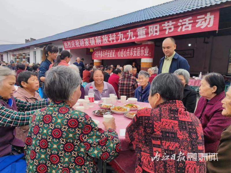 猪肚煲鸡汤、清蒸鲶鱼 ……中午12时,隆昌市胡家镇同心村、解放村、蒲芦村的重阳节营养大餐开吃了。近千名老人围坐在大圆桌前开心就餐。村干部、志愿者端菜倒茶,协助老人夹菜用餐。“今天的菜很合胃口,软糯又好吃。”99岁老人黄世明一个劲儿地点赞。