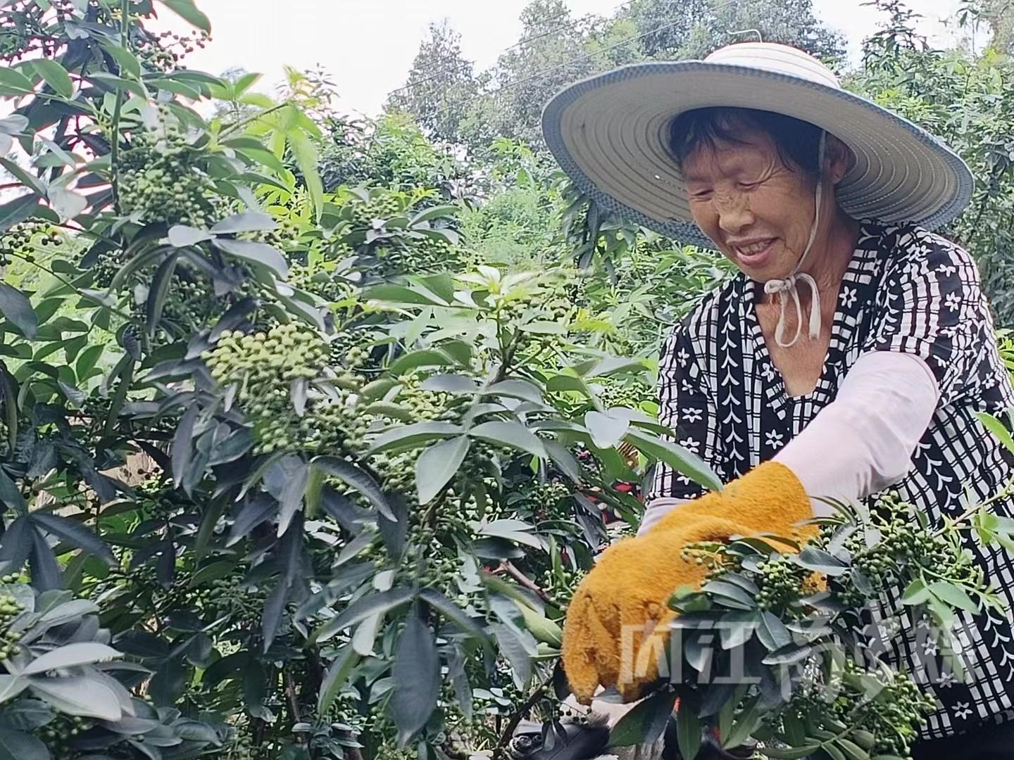 村民胡绍联年过花甲,已在这个花椒基地干了十多年。她头戴草帽,拿着剪刀穿梭在花椒林中,麻利地将一根又一根长满花椒的枝条剪下来,然后分配给负责采摘花椒的同伴。