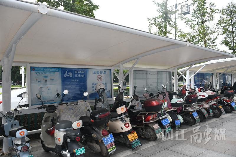 7月31日,位于隆府·上座酒店大门口的非机动车充电桩棚内,数十辆电动车停放整齐,不少电动车正在充电。