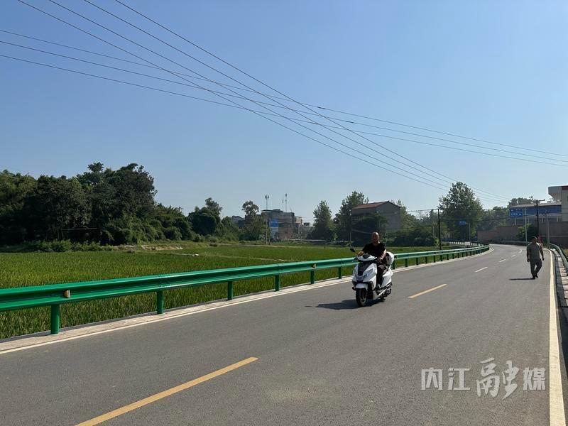 成片的高标准农田旁、护栏外是平缓宽阔的道路,摩托车、农用车、小货车在道路上自由往来。沥青铺筑的路面上,白色的标线清晰明了,把道路衬托得更整洁。