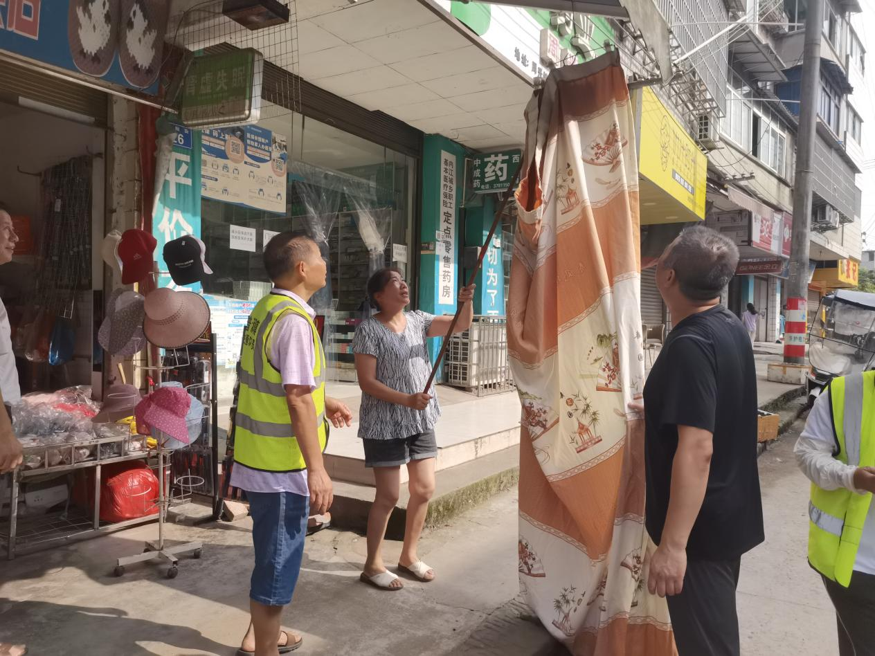 在门店前搭建遮阳网,不仅挤占了人行道,导致日常通行受阻,甚至对周边区域产生了消防安全隐患。普润镇结合辖区实际情况,采用“分段清”整治办法和人性化的执法方式,耐心向商铺讲解场镇环境管理方面的规定,要求商铺在规定的时间内拆除门前私自搭建的遮阳网。