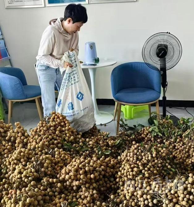 村民家缺少劳动力,干部骑着两轮摩托、开着三轮车和小车去帮忙,将采摘下来的桂圆运到村办公室,分装后送到客户手中。