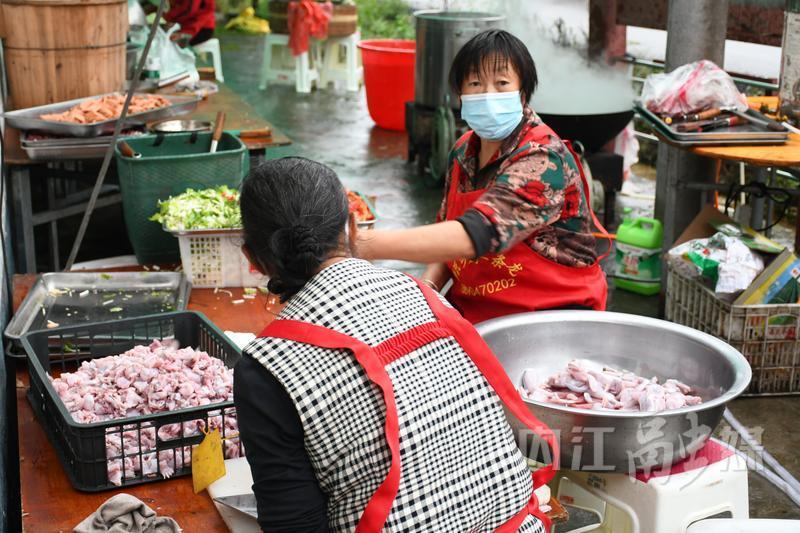 10月11日,重阳节。上午8点过,隆昌市胡家镇同心村,绵绵细雨中,志愿者忙着搭遮雨棚、摆桌椅、打扫卫生;乡厨穿上围裙,洗菜、切菜,将蒸笼摆放整齐。