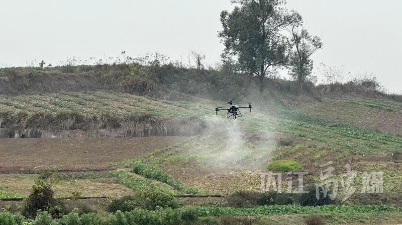 在技术人员的熟练操控下,无人机起飞,朝着对面山坡上的油菜地飞去,抵达目的地上空后,机载喷头将白色药剂均匀地喷洒在油菜苗上。