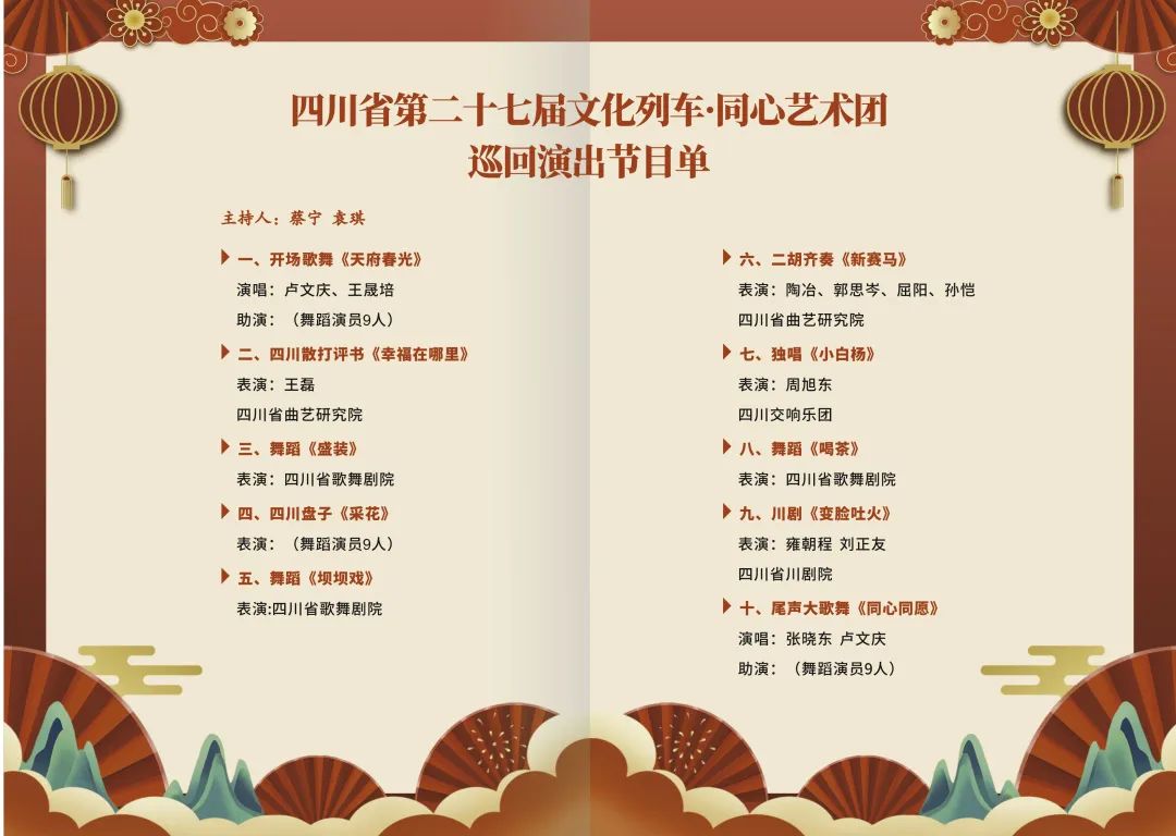 活动期间,四川省歌舞剧院、四川省曲艺研究院、 四川交响乐团、四川省川剧院的演职人员将带来歌舞表演、川剧、二胡齐奏、散打评书等10个精彩节目。