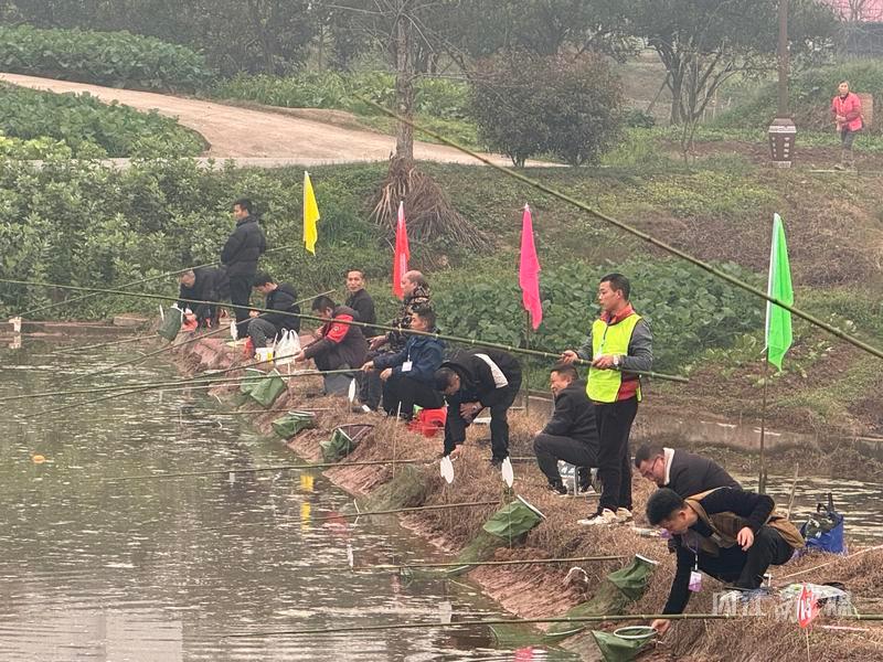 广场上的趣味体育赛热闹非凡,点燃了冬日的热情。而在广场旁的池塘边,参加钓鱼比赛的选手们沉浸在一片宁静与专注之中。大家手持钓竿,身姿沉稳,眼睛紧紧盯着水面,不放过任何一丝动静。荣昌区安富街道的参赛选手邓福彬神情专注,他轻声说道:“平时我就很喜欢钓鱼,所以我一接到村里的通知,就马上报名了,也想借此机会和隆昌的兄弟朋友切磋钓鱼技术。”