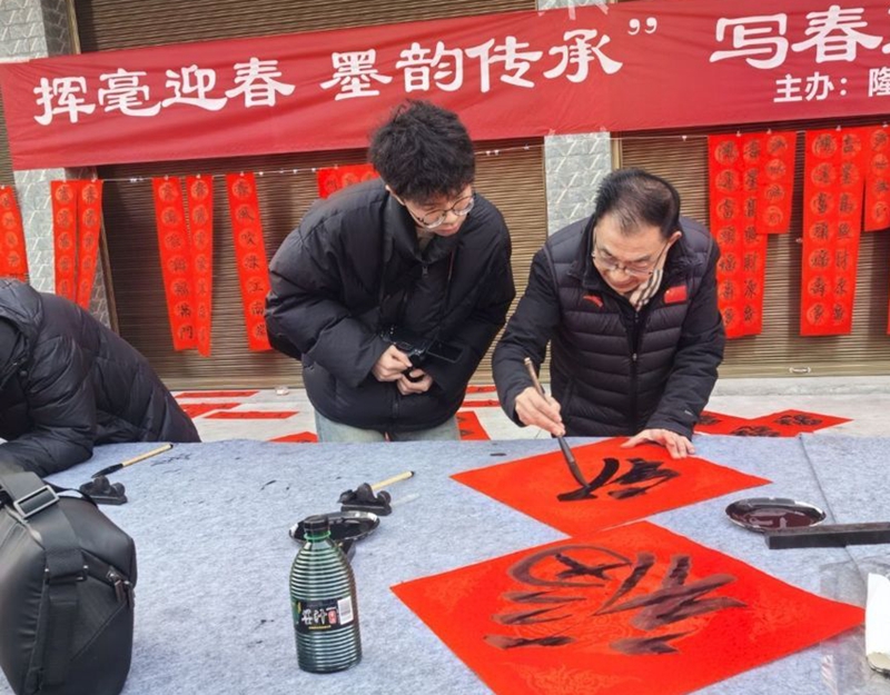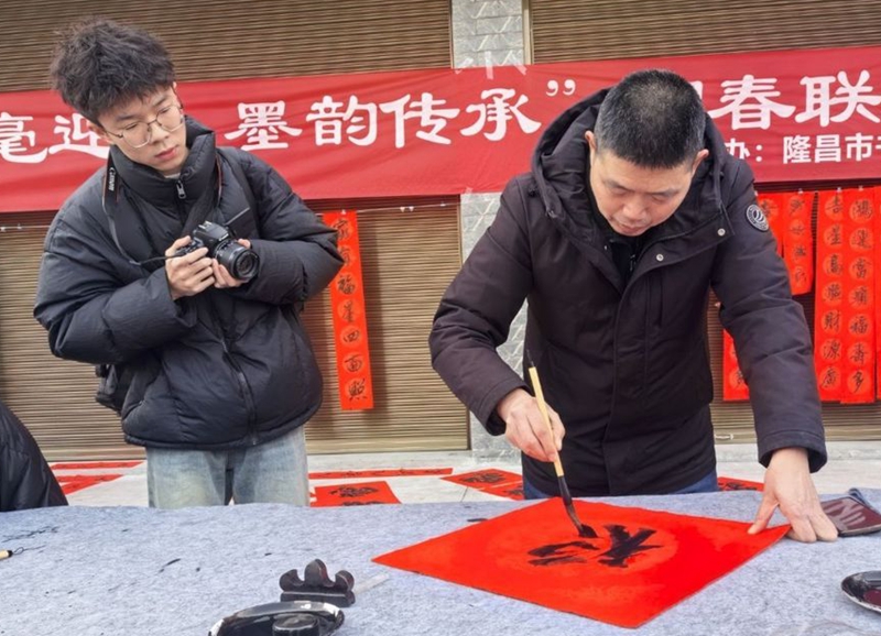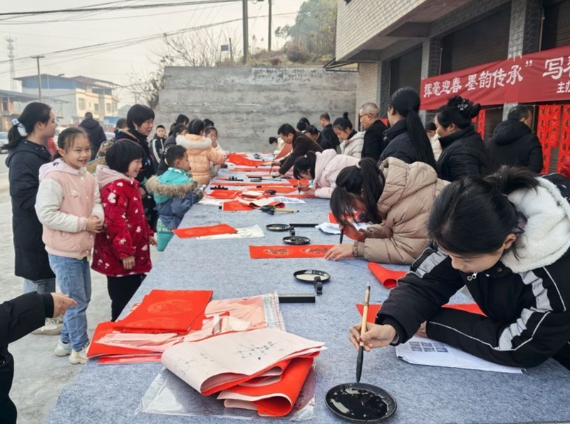 活动现场,人头攒动,热闹非凡。隆昌市书法家协会名誉主席廖斯明等人及平安小学20余名师生代表早早地来到现场,摆好笔墨纸砚,挥毫泼墨。一副副散发着清新墨香的春联在他们笔下诞生,楷书、行书、隶书等多种字体各显神韵。“一帆风顺年年好,万事如意步步高”“春临大地百花艳,节至人间万象新”等寓意吉祥的词句,饱含着对新年的美好憧憬。
