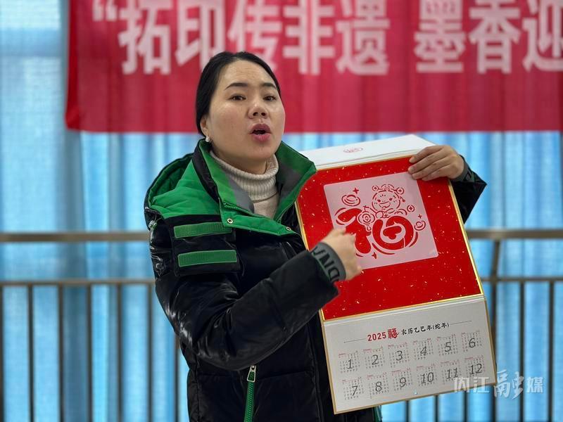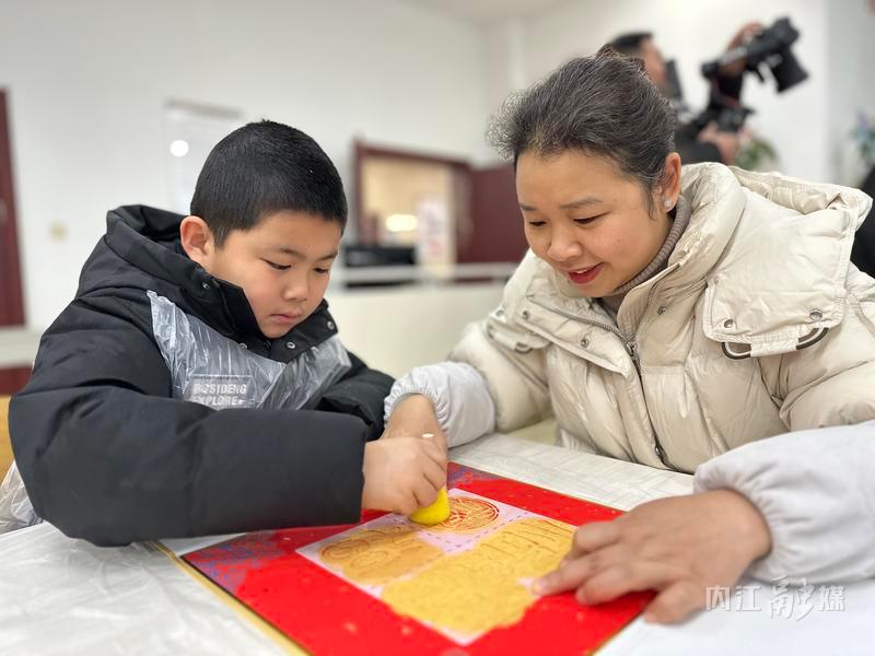 梁庆思带着两个女儿来到现场体验拓印,一起完成了作品“年年有余(鱼)”,金色的文字、图案与大红带金的宣纸相得益彰,浓郁的喜庆氛围被拉满。“我是第一次接触这项技艺,感觉非常有意思,这样的活动不仅能提升我和孩子的文化素养,还能增长见识。”梁庆思打算把拓印作品挂在家里,留作纪念。
