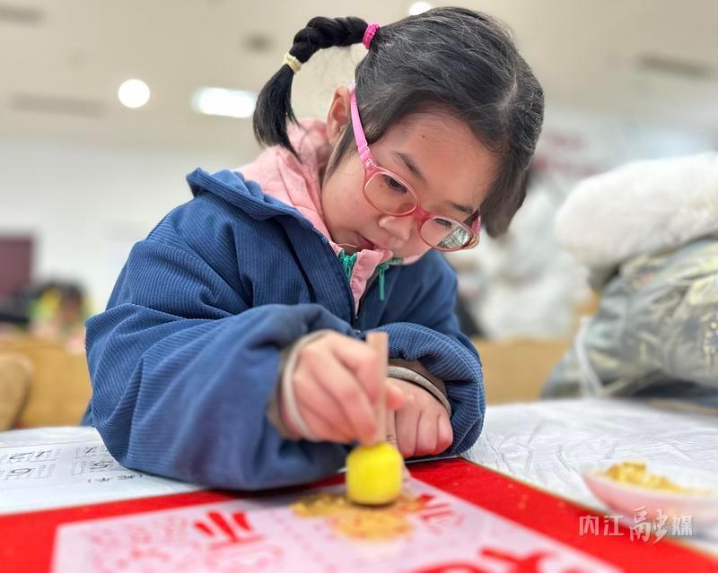 有趣的拓印活动激发了大家的动手热情。在曾巧丽的悉心指导和家长的耐心协助下,孩子们挑选心仪的春节元素,用海绵拓包蘸取金色颜料,从覆盖在宣纸上的拓片中间向四周均匀拍打,使拓片上的凹凸纹理逐渐清晰显现。“以前只是听说过非遗拓印,今天体验后才发现其中蕴含着如此丰富的学问。希望以后能多举办这样有意义的活动。”参与者王颢寒感慨道。