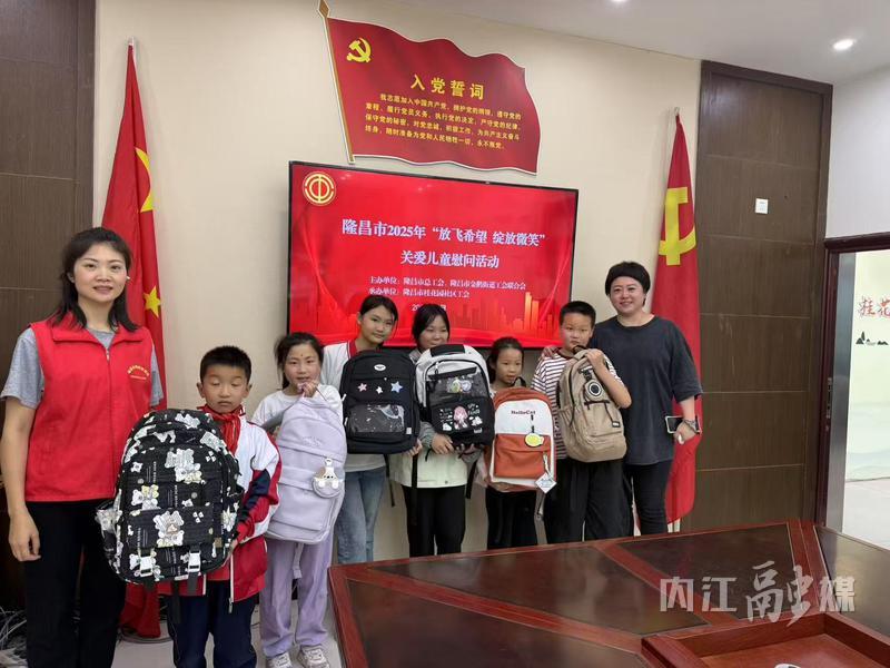 同时,在大南街小学,隆昌市教育工会委员会开展留守儿童及困境儿童关爱活动,为13名孩子送上精心准备的书包等学习用品,孩子们手捧新书包,脸上绽放出纯真笑容。