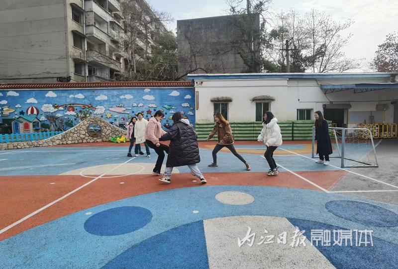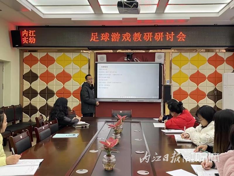 近日,内江市实验幼儿园教研组人员在体能老师李文章的带领下开展足球游戏教研活动。
