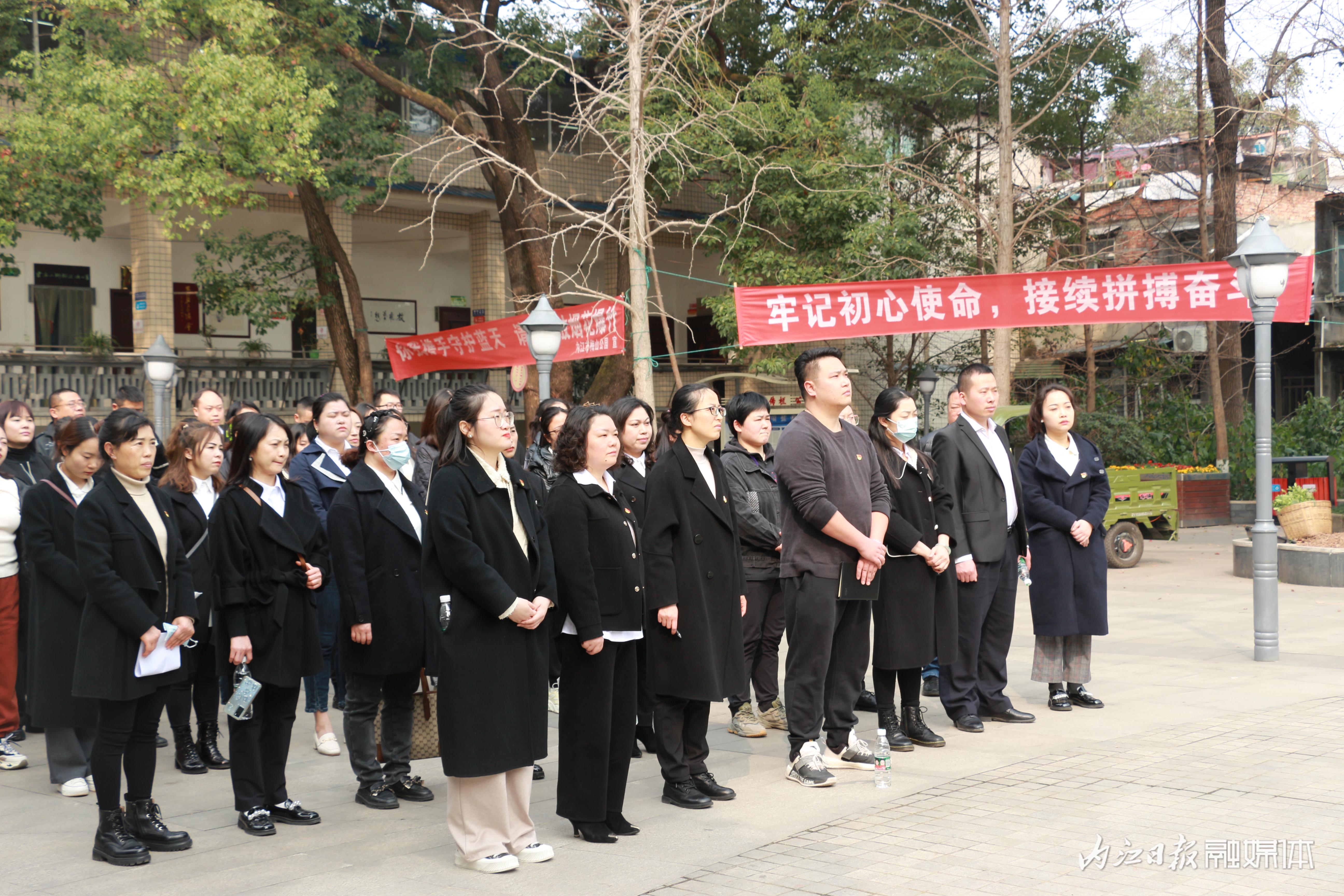 3月6日,市中区牌楼街道开展“坚定不移抓作风,凝心铸魂激斗志”活动。图为在成渝铁路筑路纪念碑前集体合影
