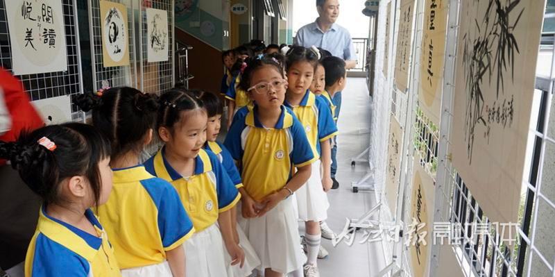 在老师们的带领下,小朋友们排着整齐的队伍,欣赏着书画家们的作品。孩子们乖巧地站在一旁,目不转睛地看着,时不时还会和同行的小伙伴交流几句,也渴望能够用毛笔写下自己的名字。