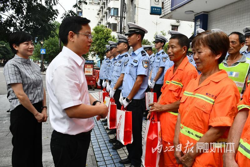 7月21日,内江市市中区委副书记、区长岳光科带队开展夏季“送清凉”走访慰问活动,看望坚守在一线的劳动者,为他们送上防暑降温物品,并通过他们向冒着高温酷暑奋战在各行各业的一线劳动者表示崇高敬意和由衷感谢。