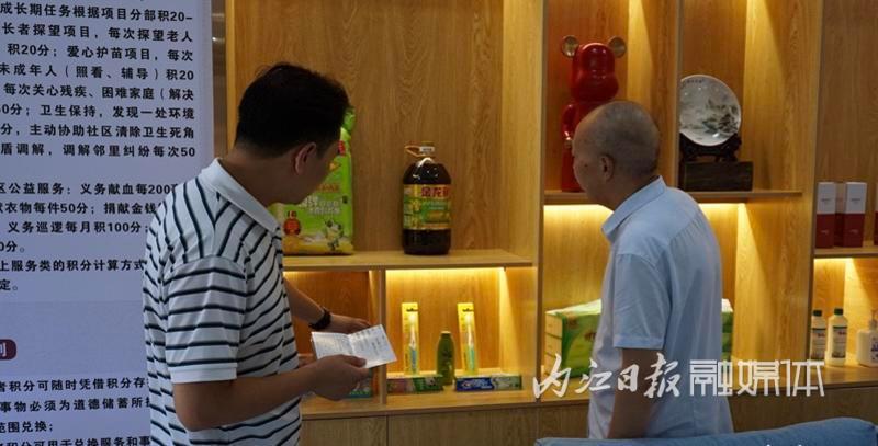 “罗大爷,你的积分在我们社区算高的,这里的东西你都可以选择兑换。”接待罗先有的社区常职干部张菀把老人带到积分兑换区,耐心地向他介绍相关情况。
