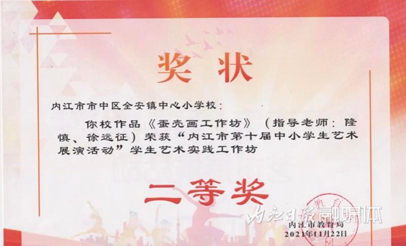 “我校蛋壳画工作坊于2015年创建,2019年成功创建为内江市优秀学生艺术团,为切实落实“双减”工作,学校结合课后服务常态化开展活动。现在开设有蛋壳拼画、蛋壳绘画、蛋托画,主要培养孩子们的动手能力和专注力。”市中区全安镇中心小学校党支部书记、校长王旭表示,学校将继续致力于蛋壳画的创新、创作,让农村孩子在活动中感受美、发现美、创造美。