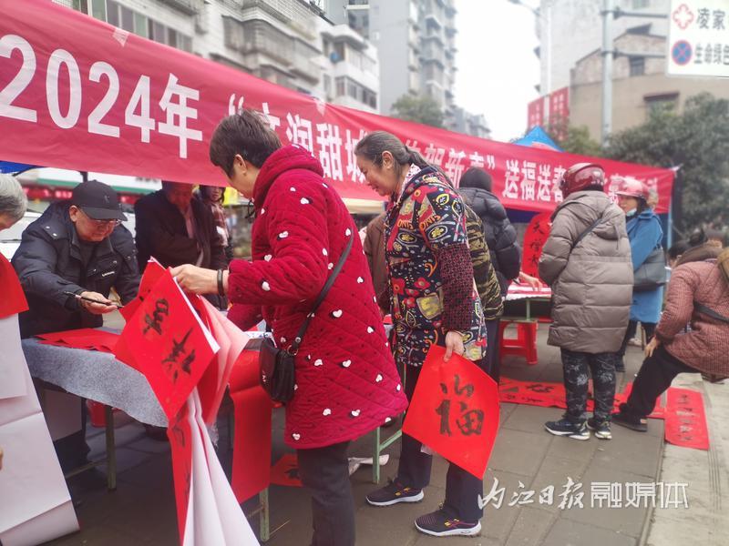 在新春佳节来临之际,为弘扬中华民族传统文化习俗,丰富群众精神文化需求,营造喜庆祥和的节日氛围,2月4日上午,市中区凌家镇文化综合服务中心联合内江市老年书画研究院开展“文润甜城·艺贺新春”送福送春联文化惠民活动,为群众写春联、送祝福,现场欢声笑语、热闹非凡。