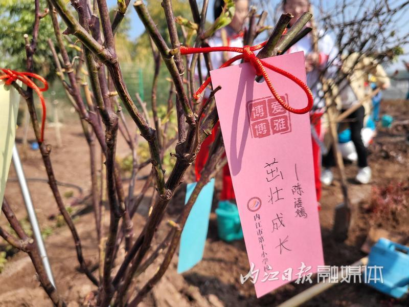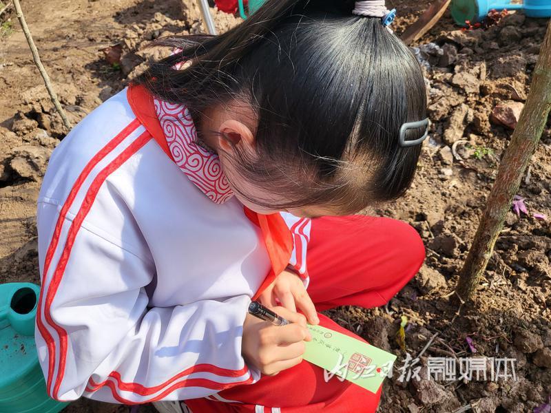放苗扶树、挥锹填土、踩土固苗、提水灌溉……大家干得热火朝天,20棵小树苗很快便栽种完毕。孩子们热情高涨,在心愿卡上写下美好的愿望,小心翼翼地系在树苗上。