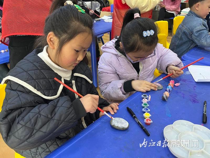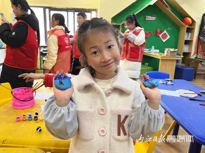 活动内容为鹅卵石绘画教学。活动过程中,内江灵犀社会工作服务中心志愿者向孩子们讲解了鹅卵石绘画的基础知识、鹅卵石绘画的技巧及绘画过程中的注意事项。此外,志愿者展示了之前完成的鹅卵石绘画作品,让孩子们通过动眼观察,直观地感受到鹅卵石绘画的乐趣。在绘画过程中,志愿者引导孩子们观察、思考,鼓励其动手创作;创作完成后,志愿者让孩子们展示自己的作品,为大家分享自己的成品。