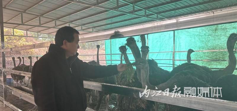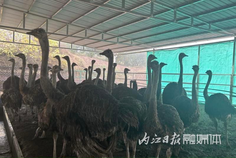 近日,记者走进内江市市中区朝阳镇周坡村鸵鸟养殖基地看见,一只只憨态可掬的鸵鸟瞪着大眼睛、迈着大长腿在围栏内东张西望,工人们忙着搅拌饲料,给鸵鸟准备“午餐”。