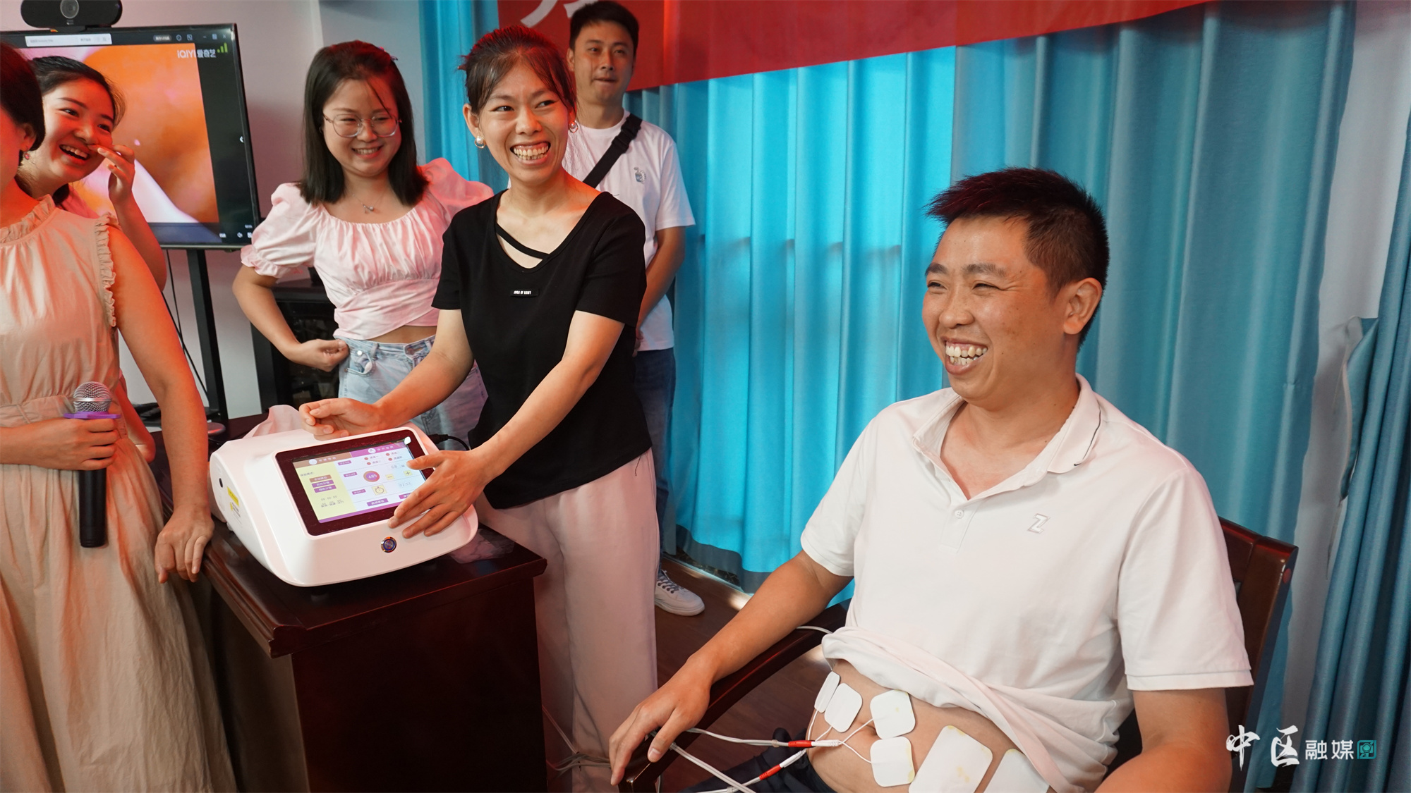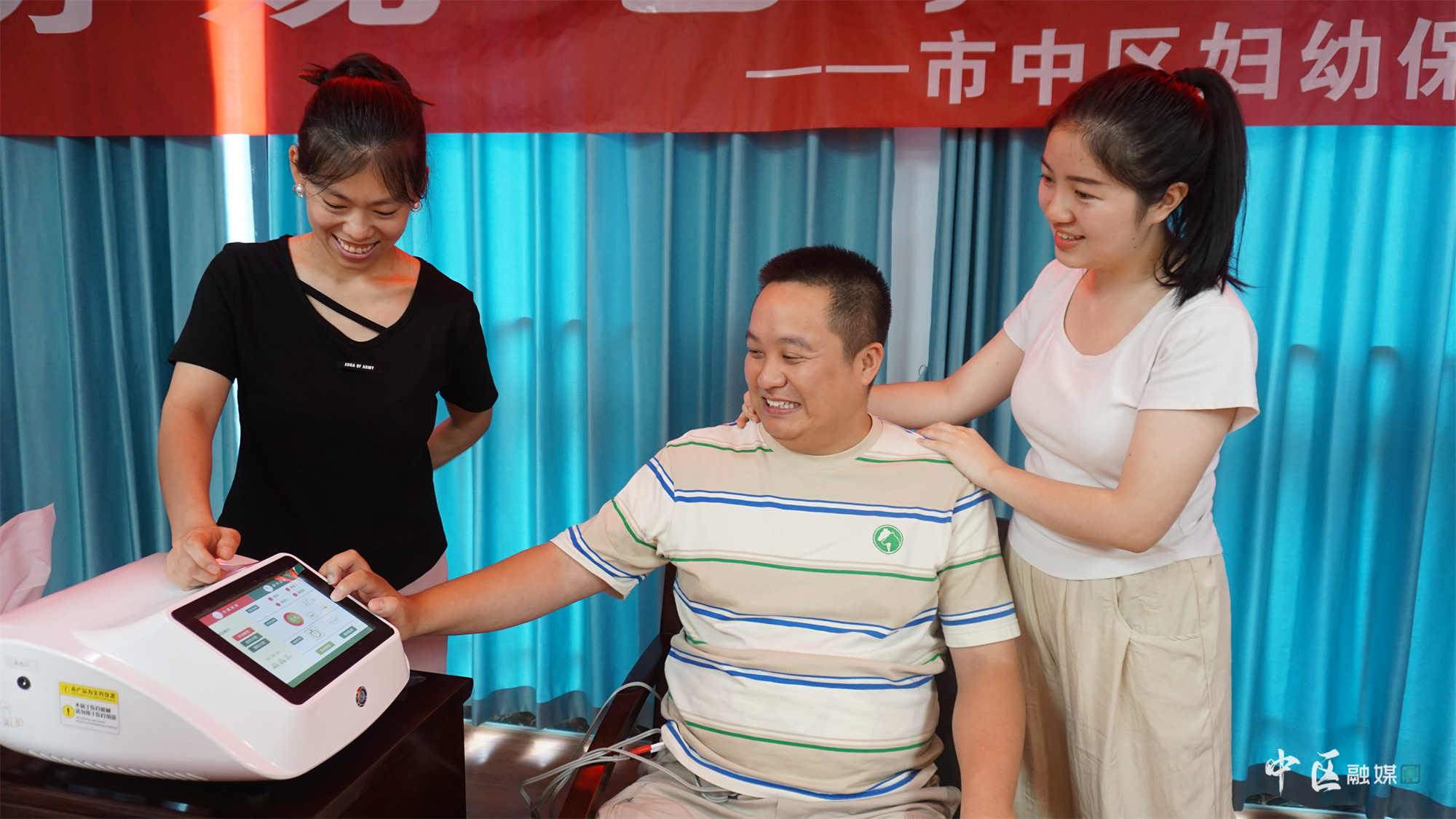 讲座结束后,本次活动的重头戏登场。为了让准爸爸们能够体会到妻子们在分娩时的疼痛与辛苦,医护人员们利用专业的仪器让准爸爸们亲身感受分娩时的疼痛。