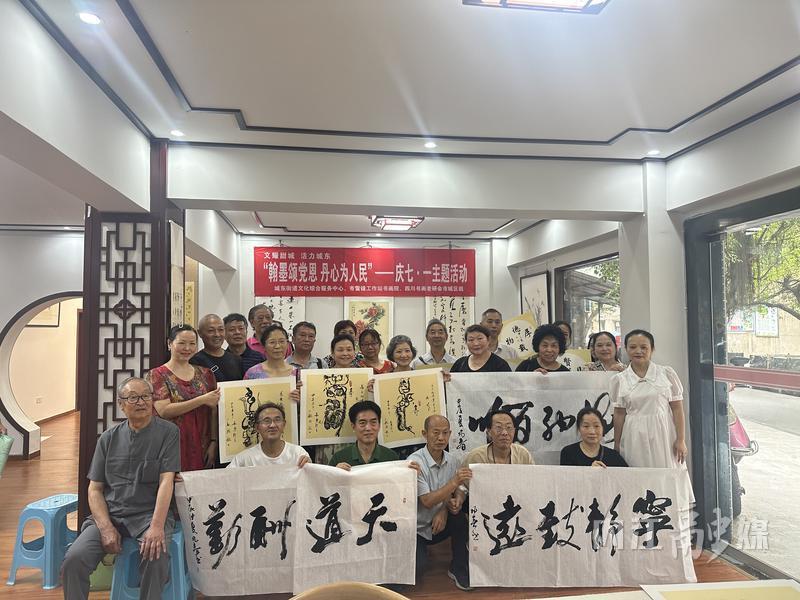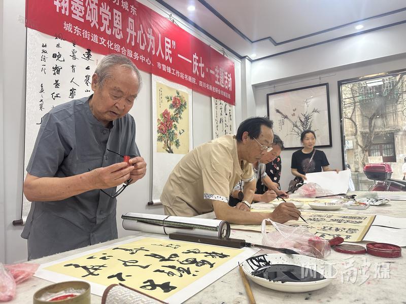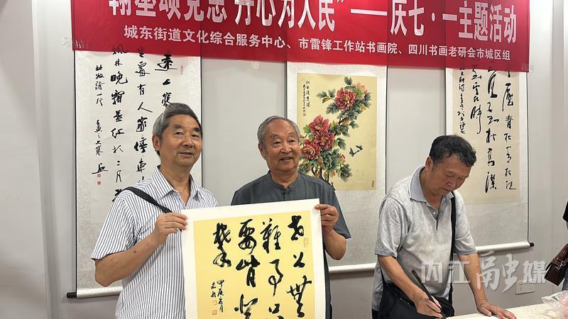 当天上午,在市中区城东街道文化综合服务中心召集下,内江市雷锋工作站书画院、四川书画老研会市城区组的书画爱好者齐聚城东街道书画社。书画爱好者们纷纷挥毫泼墨,创作出一幅幅令人赏心悦目的书画作品,浓墨重彩地抒发了对党和祖国的热爱,描绘了对美好生活的祝愿。市中区城东街道文化综合服务中心工作人员忙着晾晒这些书画作品,并送给辖区老党员。
