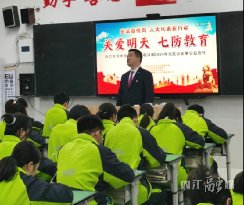 今年12月1日至12月7日是第七个“宪法宣传周”,为深入加强青少年法治宣传教育,进一步弘扬宪法精神,提升青少年的法律意识与自我保护能力,营造浓厚的校园法治氛围,12月3日至6日,市中区人大代表程从刚积极推动落实“我当代表为人民 我为群众办实事 履职尽责强担当”亮诺践诺事项,并结合2024年宪法宣传周部署要求,结合乡村初级中学学生特点及自身工作实际,先后深入到全区9所乡镇初级中学开展“关爱明天 七防教育”的普法宣传,用实际行动践行人大代表庄严承诺。