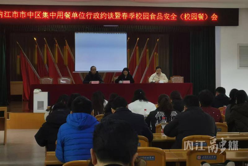 2月28日,内江市市中区市场监管局联合区教体局、区卫健局、区民政局、区民宗局,召开市中区集中用餐单位行政约谈暨春季校园食品安全(校园餐)会。辖区内各集中用餐单位负责人、食品安全管理人员及相关部门工作人员共计110余人参加会议。