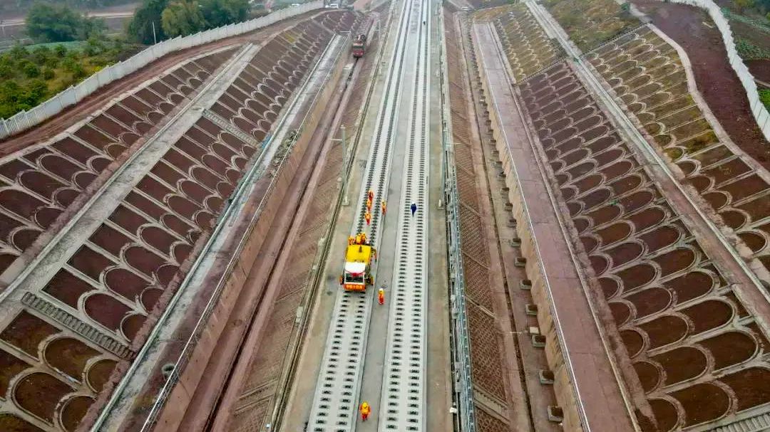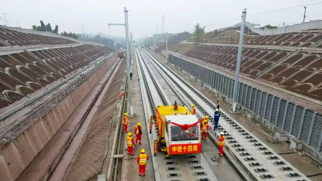成自宜高铁是四川省境内一条连接成都、自贡与宜宾的高速铁路,是国家“八纵八横”高速铁路网“京昆通道”的重要组成部分,全长约260公里,设计时速350公里,全线有隧道29座,桥210座。全线已进入铺轨、线上工程及站房建设冲刺阶段,此次铺轨(含站线)总里程共约580公里,其中包括13.8公里联络线、162组道岔等施工任务。