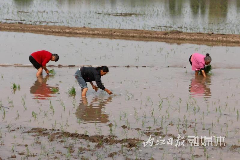 走进田间地头,大片的稻田映入眼帘,村民们卷起裤腿、热情高涨,一株株秧苗从插秧机苗盘上依次滑落,整齐有序地插入水田里……广袤的田野上一派繁忙景象。