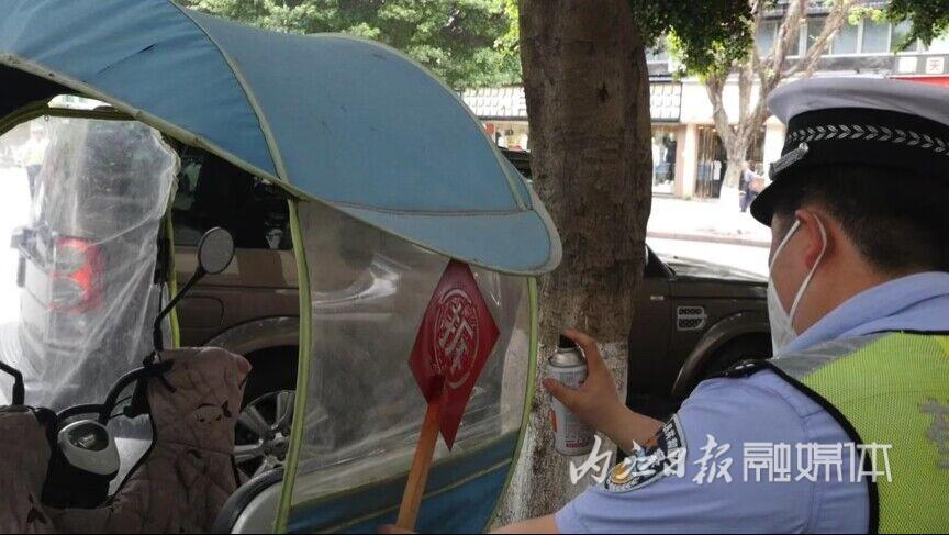 5月15日,在威远县荷花街,交警正耐心向驾驶人以及过往群众讲解加装“遮阳伞”的危害,劝导驾驶人自行拆除。加装遮阳伞车辆驾驶人不在现场的,交警则在遮阳伞上喷涂上“拆”字进行警告,由车主自行拆除,如在路上发现遮阳伞上有“拆”字的,他们将依法强制拆除。
