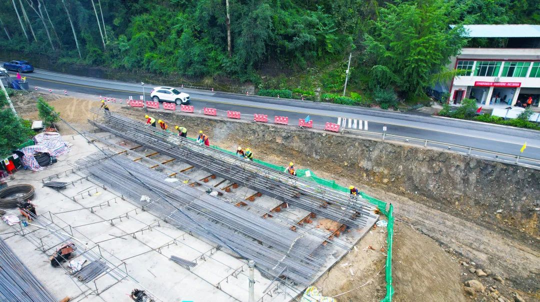 近日,在项目施工现场,记者看到,施工路段已经实行半幅封闭交通管制,施工区域已进行封闭管理,工人们正在进行抗滑桩钢筋笼制作,桩基基坑旋挖机、水泥混凝土罐车浇筑桩基砼等机械设备正在紧锣密鼓地作业。