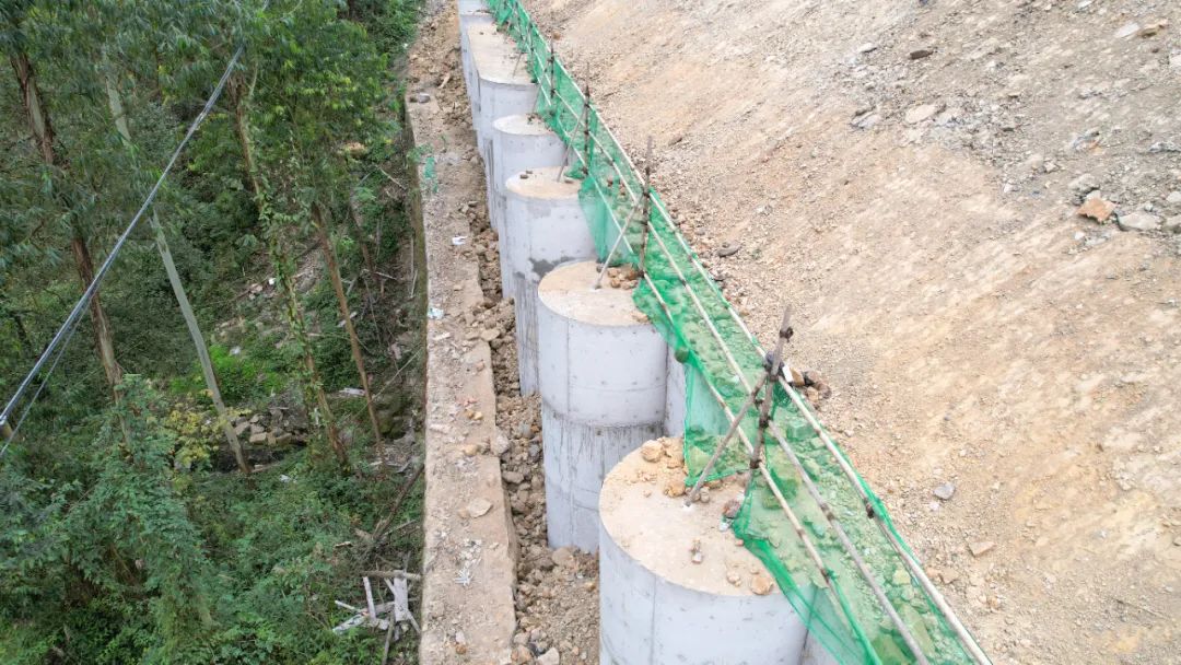 节点一是在第一个大弯道处对路面进行改线,并施工完成11个高25米的抗滑桩,防止路面滑坡。目前路基基本完成。