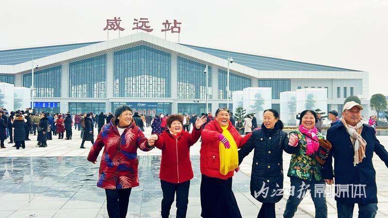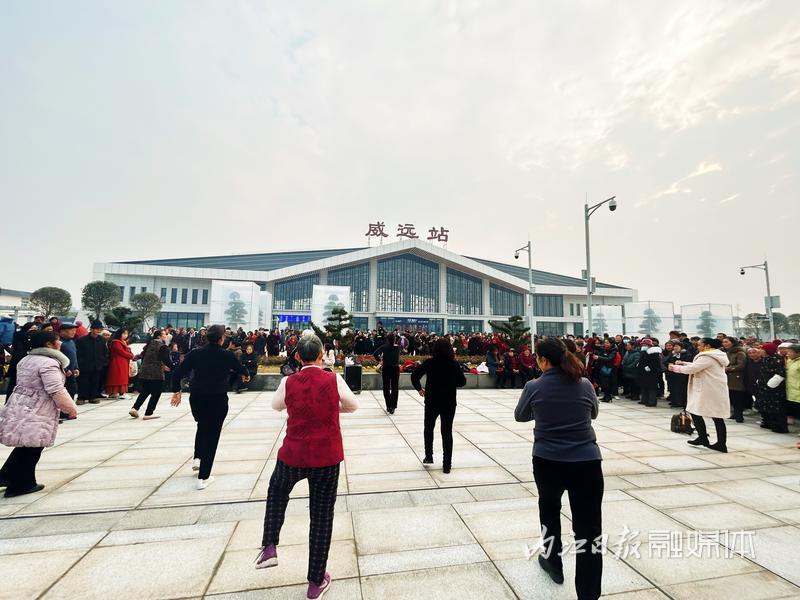 “太高兴了,我们以后可以坐高铁出去玩了,儿女回家也更方便快捷。”威远县高石镇宋秀华与家人朋友早早来到成宜高铁威远站,自发组织朋友们一起载歌载舞,用唱歌跳舞的方式庆祝威远进入“高铁时代”。
