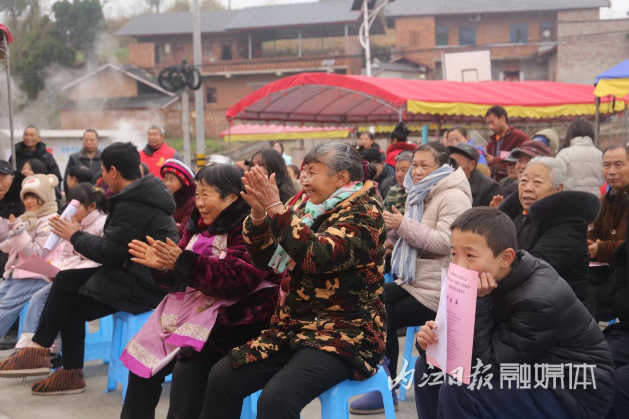 料峭寒风夹杂着绵绵春雨,丝毫没有抵挡住现场村民的热情。500余名村民欢聚一堂,同唱《盛世欢歌》,不停地为川剧绝活《变脸》鼓掌,随“别家的罗世文”流泪。大家欣赏完水袖舞《踏雪寻梅》,又聆听《春风十万里》,再回味《黄荆盛景》,在一片欢乐祥和的气氛中喜迎龙年。