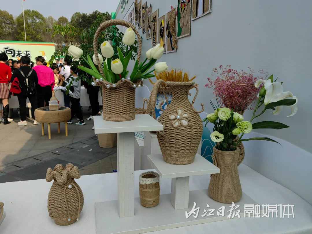 绳彩飞扬手编工作坊以大自然植物和生活废旧物品为载体,然后用麻绳加以装饰设计,变成实用美观的生活艺术品,比如手提包、花瓶、笔筒、收纳盒。孩子们在收集素材的过程中,体验和发现生活以及大自然中的美。在设计制作中他们的设计思维、动手能力和审美感知能力都得到培养和提高,达到“创意与环保同行、旧物与设计共舞”的效果。