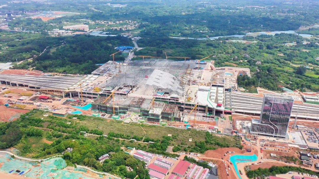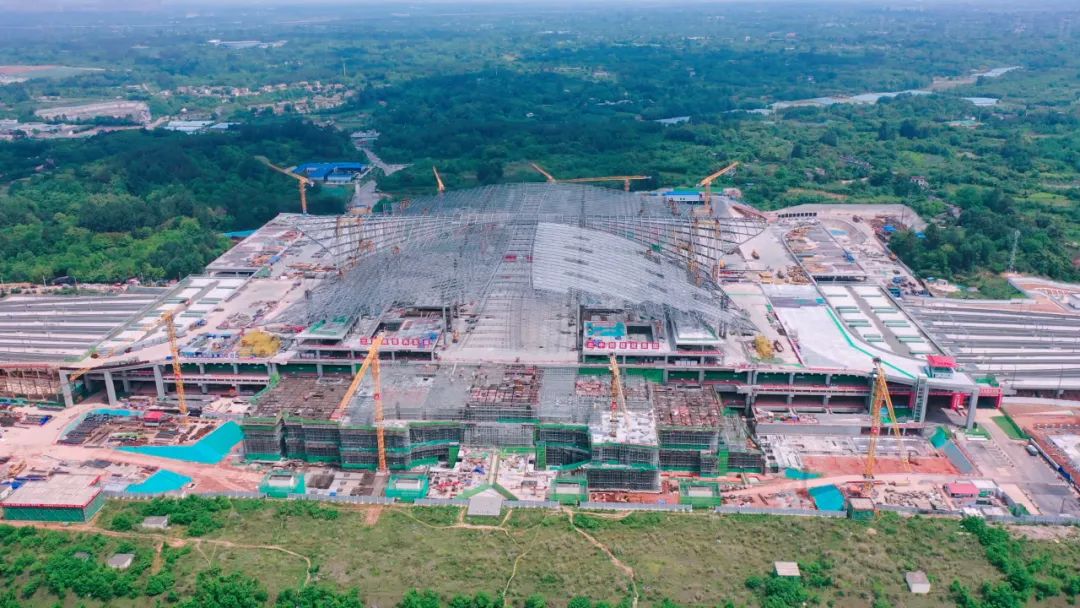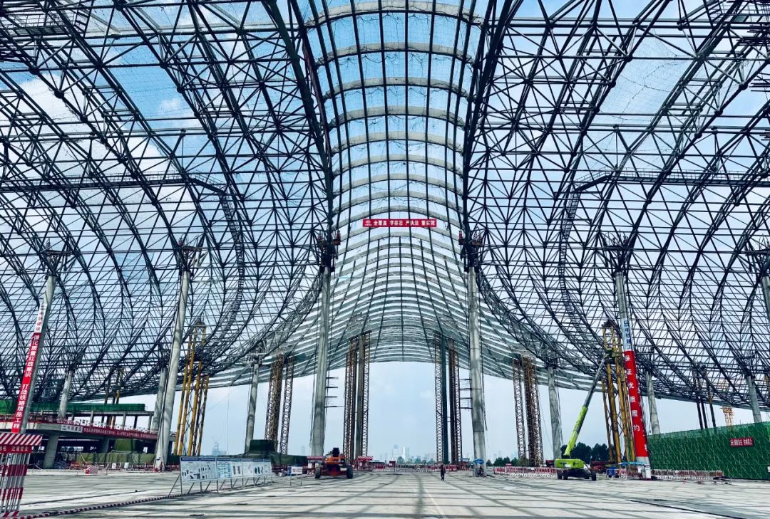 据中铁建设集团有限公司天府站项目蒋谭伟介绍,天府站分为南北场两部分建设,目前两侧的高架站房主体结构施工均已完成,车站高架站房区域的钢结构屋盖已完成整体提升。