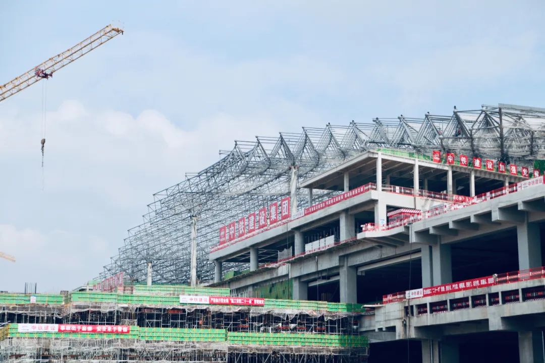 走进高架站房内,52根“下大上小”的超高变截面混凝土圆柱、12根抗风柱牢牢支撑起了纵横交错的钢结构屋盖,可谓壮观。下一步,高架站房将全面转入屋面膜结构施工及内部装饰装修阶段。