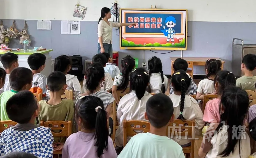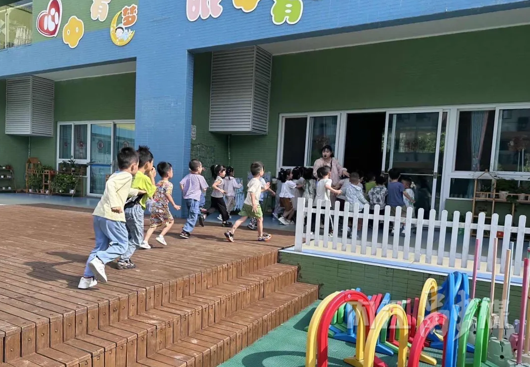 老师们迅速组织正在操场上做游戏的幼儿跑进附近的教室躲避,快速关紧教室门窗、拉上窗帘,并搬来桌椅抵住大门。在室内活动的幼儿将自己“藏”起来,保持安静,避免被坏人发现。