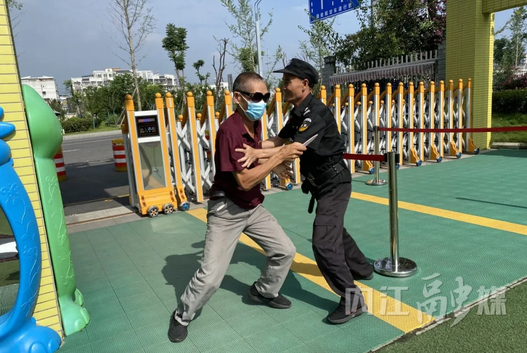 当日上午9时30分,老师带着孩子们在操场上做游戏,一名“歹徒”在幼儿园门口强行闯入,安保人员立即持防暴器械拦截,另一名安保人员快速按下一键报警器报警,拉响警铃。应急处置小组人员纷纷就近拿起防暴盾牌、拖把等工具拦截“歹徒”。