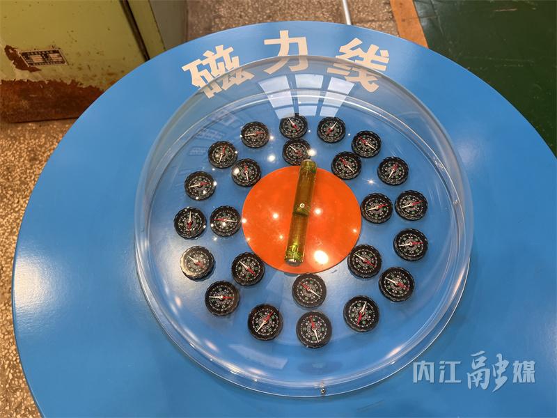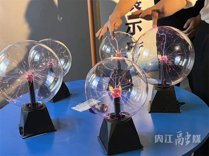 当人体手指触碰在辉光球上,球内瞬间光芒四射,闪烁的电弧随着手指闪动;当按下音乐开关,托盘里面的铁粒子欢快地跳起了舞蹈;当骑上自行车,蹬动车轮,墙上的灯泡逐个被点亮……类似这样的互动体验装置,在川威工业研学旅行营地电力能源科普馆还有很多。